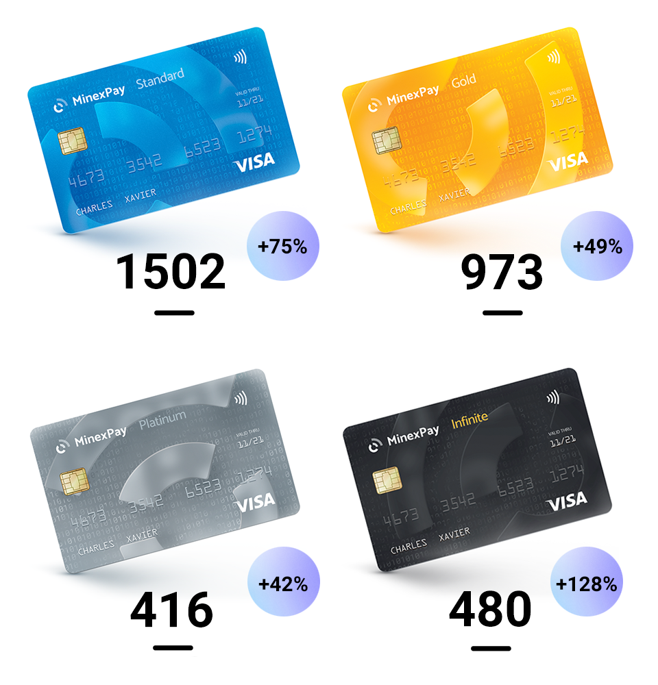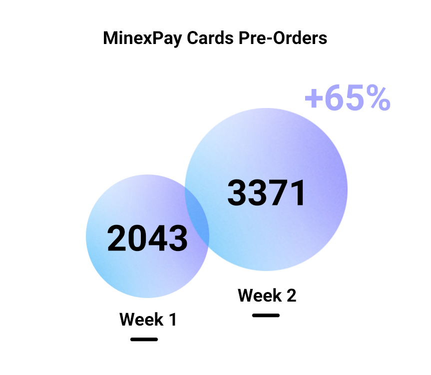 Each day, up to 240 crypto-enthusiasts pre-order MinexPay card. To our pleasant surprise, Infinite cards are far more attractive than anticipated. Numbers show a staggering +128% growth compared to the previous week! How about that?