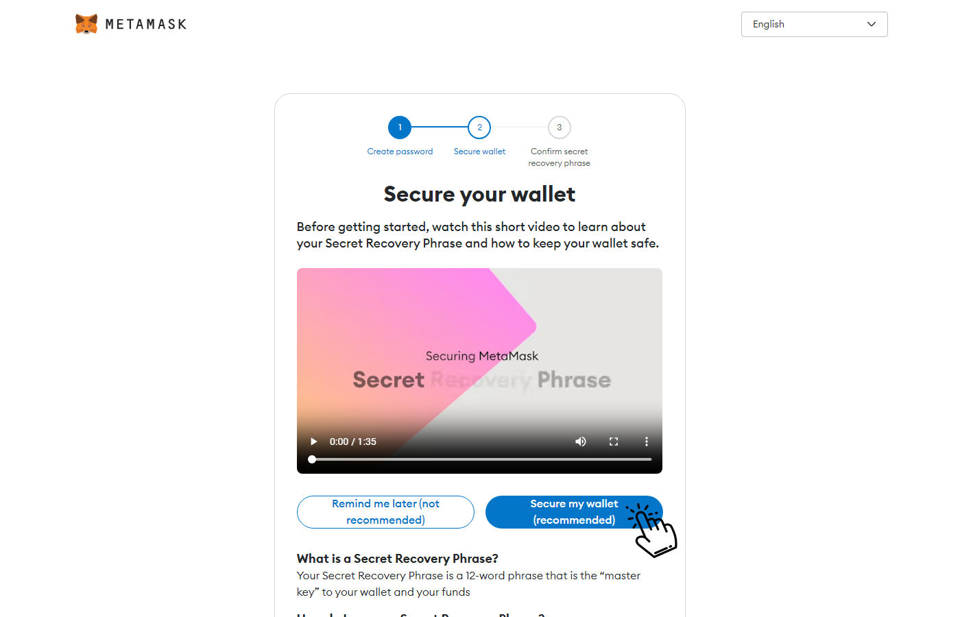 1.3 Choose “Secure my wallet”. You will have a secret phrase to restore your wallet.