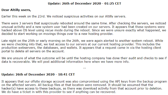 Yesterday, the cryptocurrency exchange Altilly (https://altilly.com/) went down and on their website was a notification that they had lost control of their systems. Today, the Altilly team updated the visitors with more details and indicated that the attackers not only took control of their webpage, but internal databases, and wallets. The aggressors then deleted the files on servers, web hosting sites, and even offsite backup services.