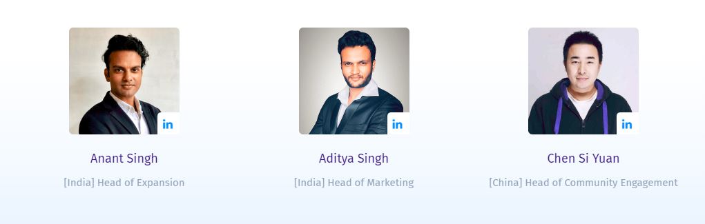 The founders of this platform are Anant Singh, the head of the extension department, Aditya Singh, the head of the marketing department, and Chen Xi Yuan, the head of the community unit. Among the other participants are Simon Schepankovsky, General Manager, Product Manager and Co-Founder, Rafael Shtviorok, Technical Director, Project Manager and Co-founder and Thomas Korvin-Gaikovsky, Blockchain Solutions Architect.