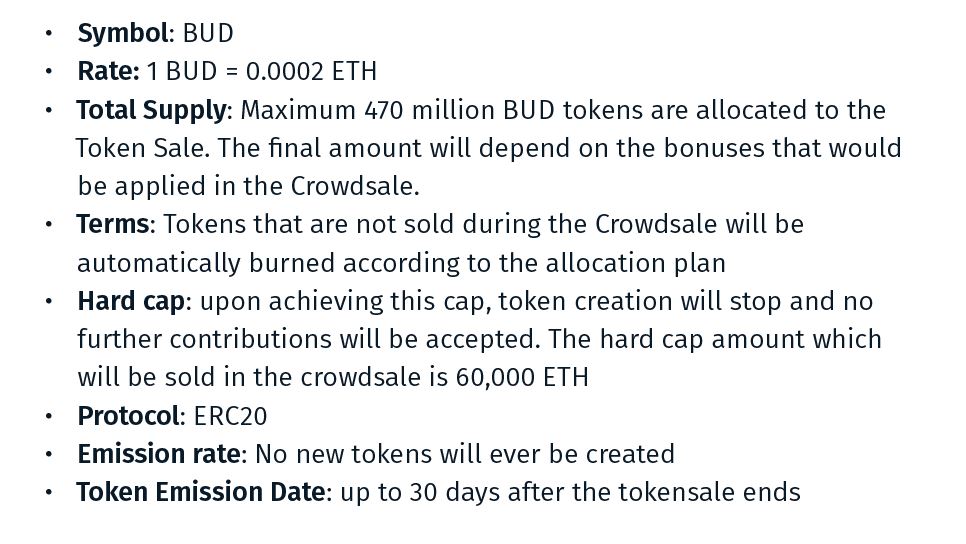 The utility token of the platform is BUD based on ERC20 protocol. 1 BUD is nearly 0.0002ETH. Total supply of BUD token for token sale is 470 million. the unsold token will be automatically burned after the token sale.