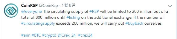 유통량은 총 발행랑 10억개 중 6개월 락이 걸려있는 2억개의 팀물량을 제외하면 8억개인데 얘네들 유통물량 조절을 하겠다는 것을 트위터 공지에 올렸습니다. 현재 거래소를 제외하고 추가 거래소 상장 전 까지는 유통량을 2억개로 제한하고 그 이상 넘어갈 시엔 추가적인 바이백으로 시세를 상향시키는 것에 중점을 둔다고 합니다.