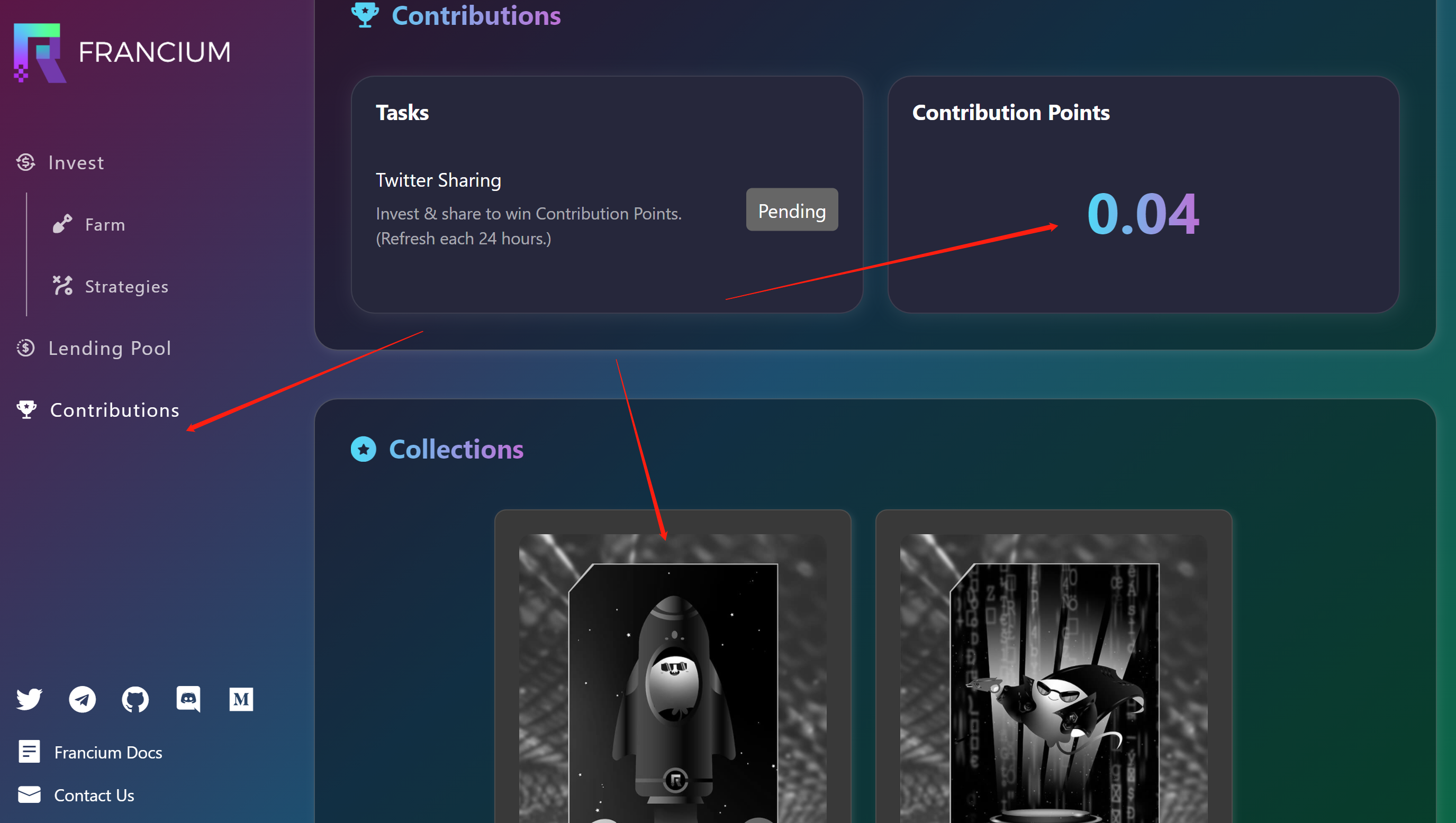 我们切换到贡献,右边的积分对应第一个奖励,下面的NFT对应第三个奖励,上面步骤完成的发推对应第二个奖励