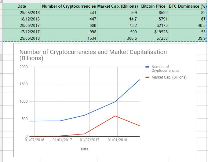 I took a snapshot of the crypto numbers, market cap and BTC price for May / December timelines commencing from May 2016 to date.