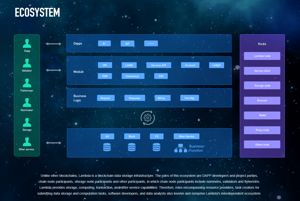 Some outstanding features in the Lambda infrastructure are Sharding technology, Multi-chain cooperative storage, and Cross-chain data management. Lambda consists of Lambda Chain, Lambda P2P, Lambda DB, Lambda FS, Lambda ABE, Lambda TPA Chain and Lambda Agent.