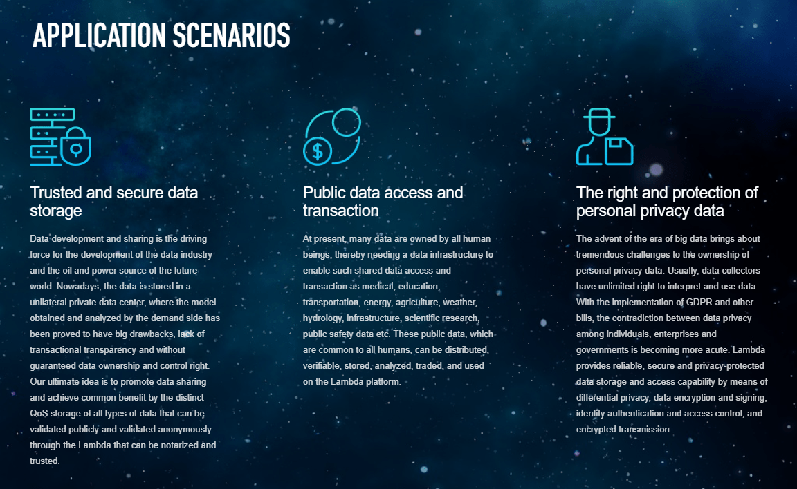 Lambda is developed to provide high-speed, secure and scalable blockchain infrastructure which can provide storage capacities and deal with several millions of transactions per second. The infrastructure can be applied to a number of use cases such as trusted and secure data storage, public data access and transaction, IoT data storage and artificial intelligence data.
