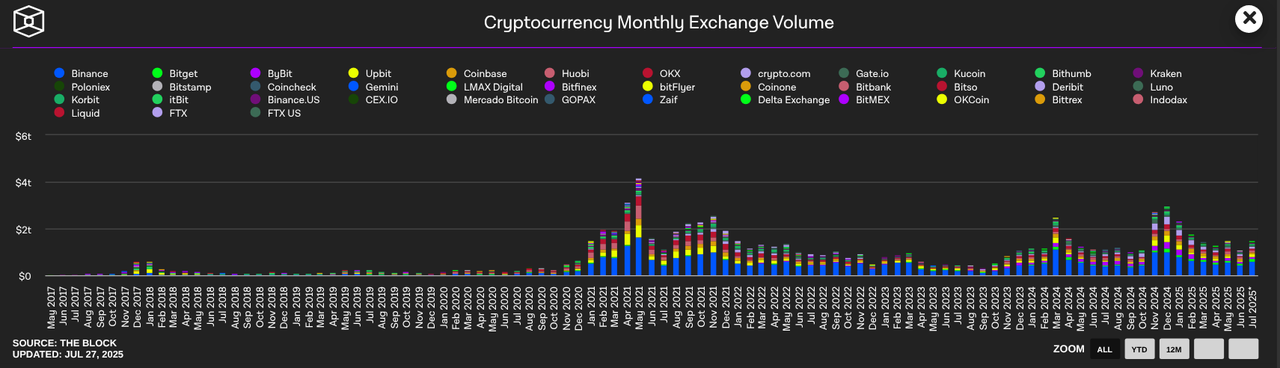I asked around on Brave Search and the following numbers came up for the cryptocurrency exchange volume. There must be a significant amount of volume from DEXs, OTC and small CEXs that is not represented in the data. That is fine because we are mainly looking at the trend.