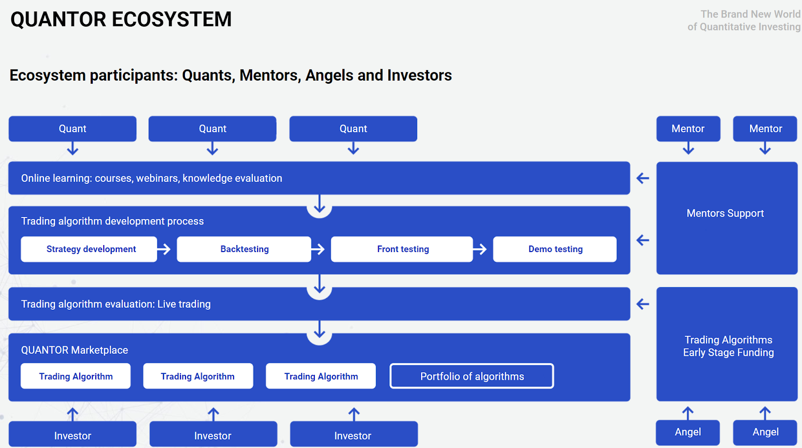 Онлайн-обучение давно доказало свою эффективность и сделало приобретение знаний поистине неограниченным для всех. Quantor также будет служить образовательной платформой, где лучшие специалисты будут обучены и отобраны для создания наиболее эффективных алгоритмов, а после тестирования наиболее ценным продуктам будут предложены инвесторы.