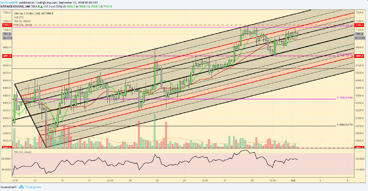 Right now, Bitcoin is riding the .382 fib on the pitchfork. Our re-entry around $6800 is doing well still, up 3%.