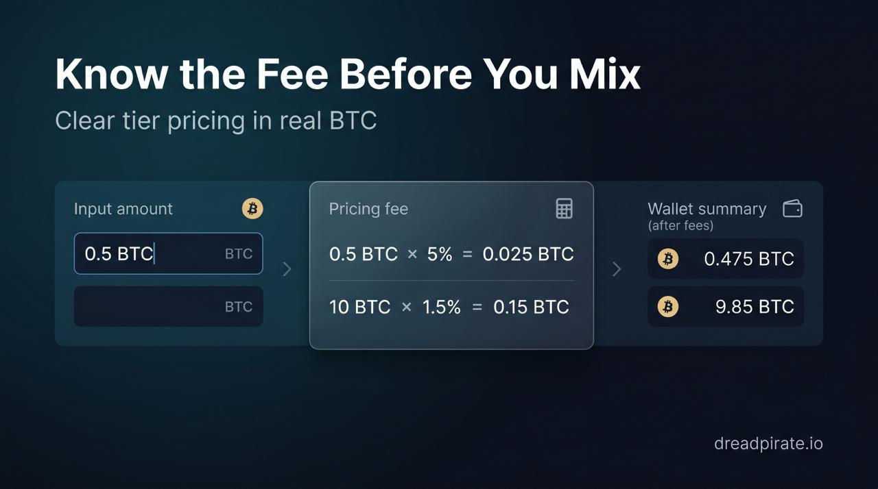 DreadPirate presents a structured approach to crypto mixer rates, combining transparent pricing with verifiable security mechanisms. The bitcoin mixer fee calculator concept helps users move beyond percentages and understand real costs.