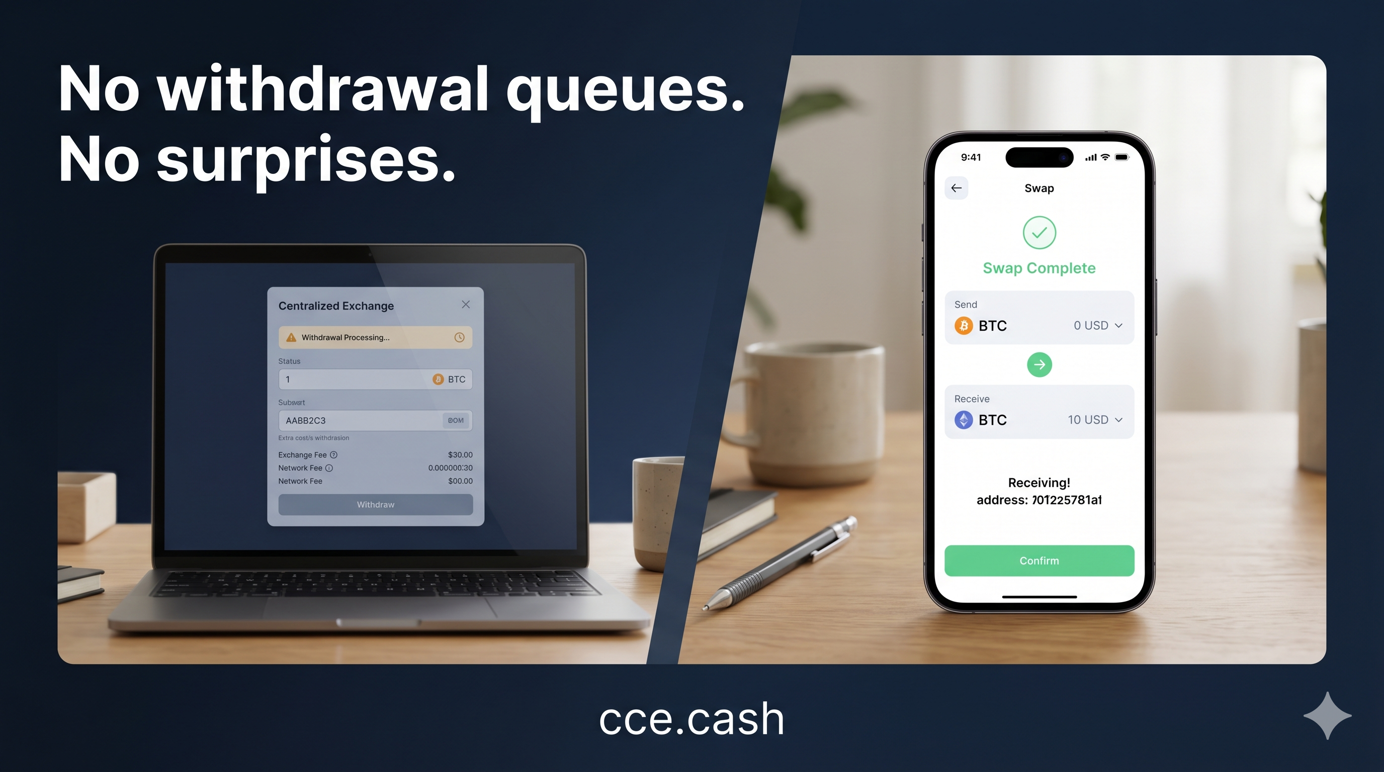 CCE Cash avoids these layers by using a fully automated exchange model. Instead of holding funds, the system processes swaps directly after detecting deposits and sends assets to the target address.