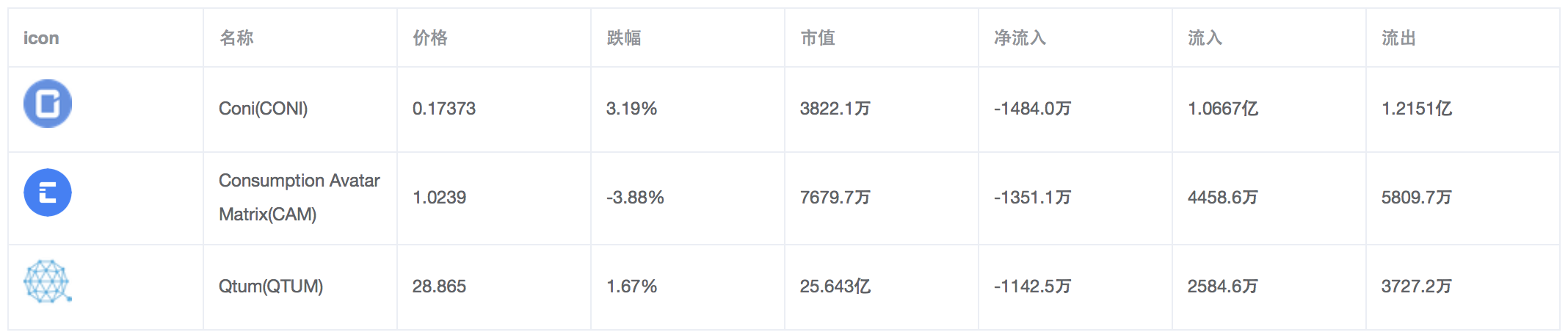 净流出排行榜前三的是CONI、CAM、QTUM(量子链)