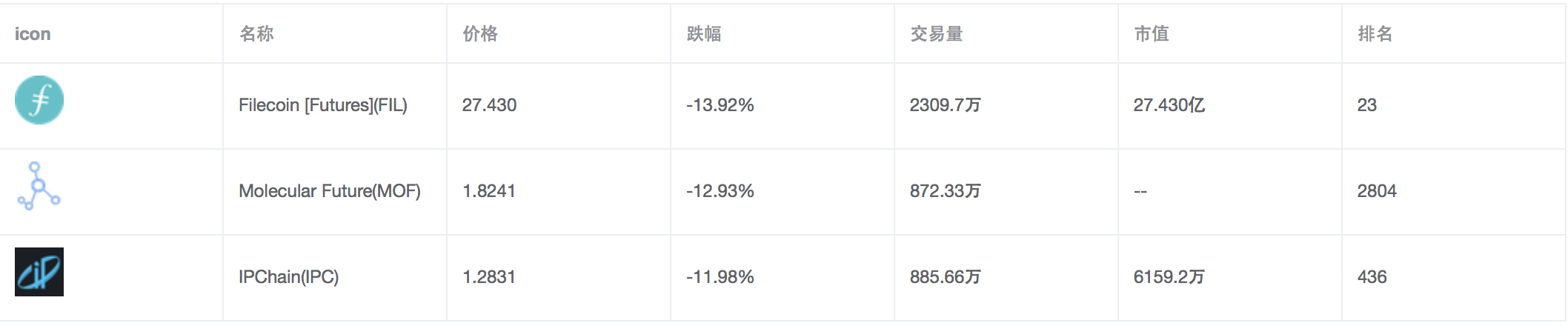 跌幅排行榜前三的是FIL(星际文件系统)、MOF、IPC(知产链)
