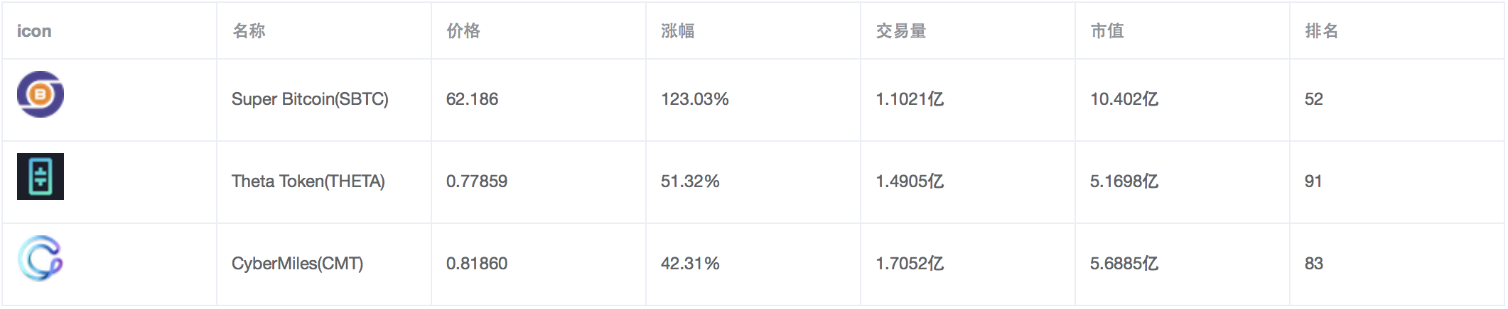 涨幅排行榜前三的是SBTC(超级比特币)、THETA、CMT(草莓糖)