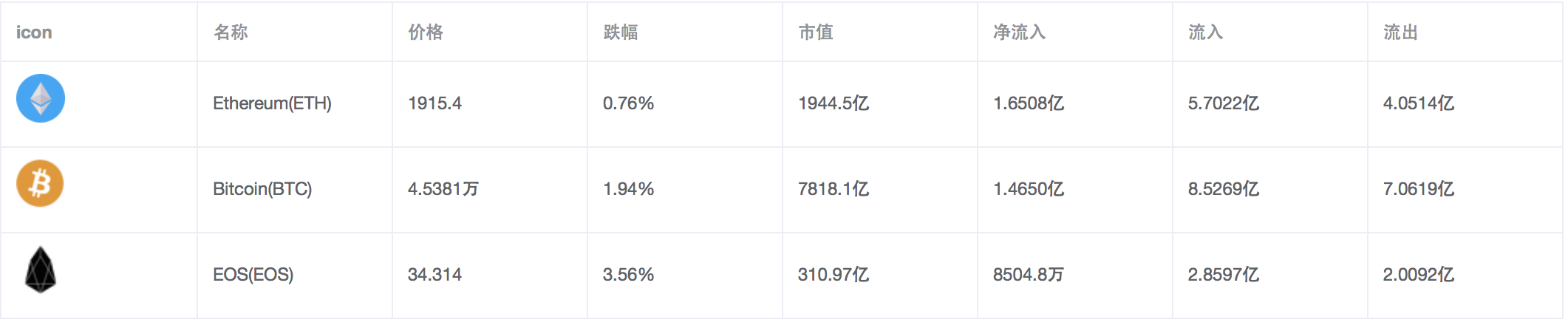 净流入排行榜前三的是ETH(以太坊)、BTC(比特币)、EOS(柚子)