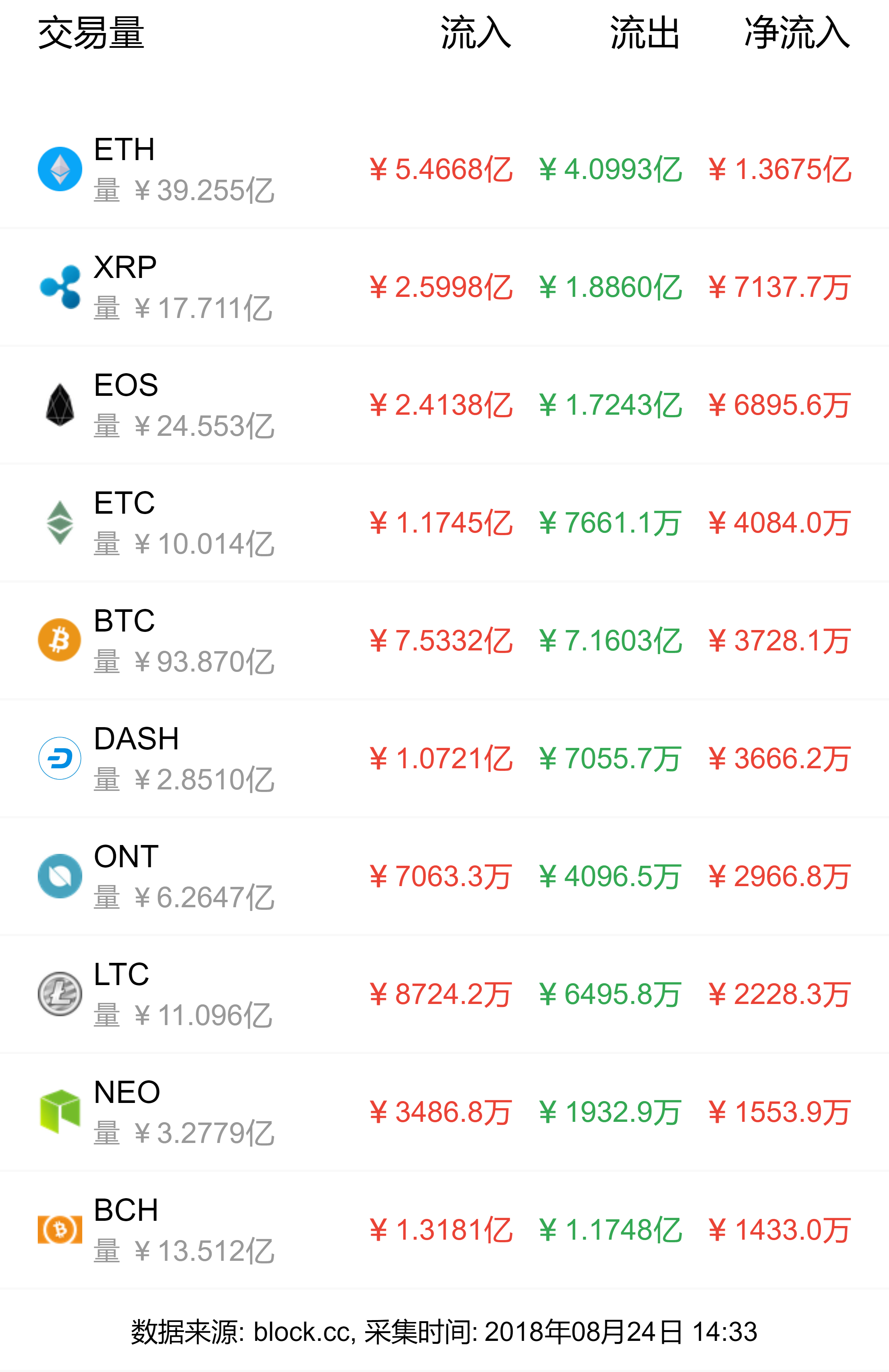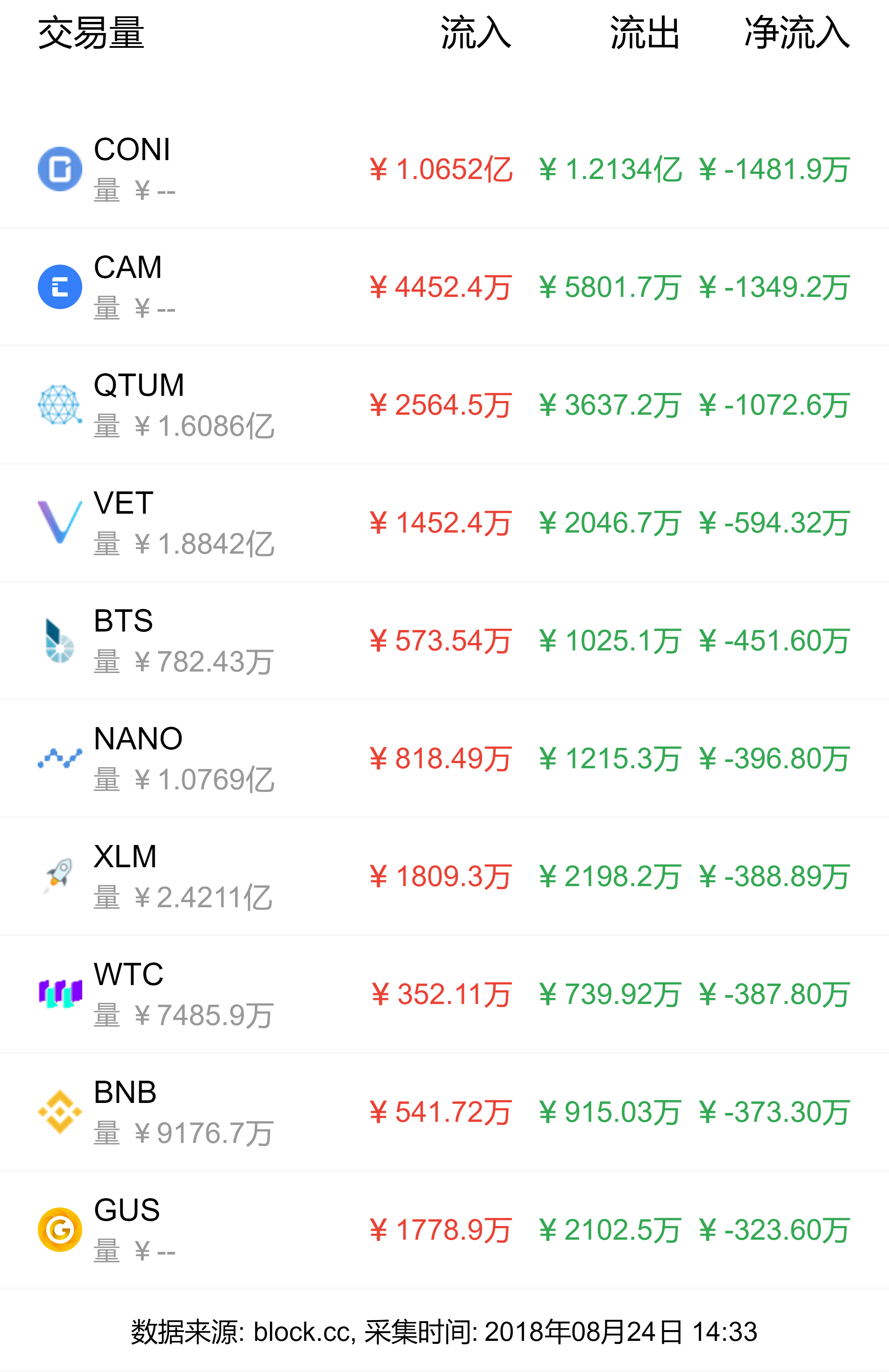 今日资金净流入榜首为ETH,净流入1.3675亿元;XRP稳居二位,净流入7137.7万元。资金净流出榜首为CONI,净流出1481.9万元;第二名为CAM,净流出1349.2万元。