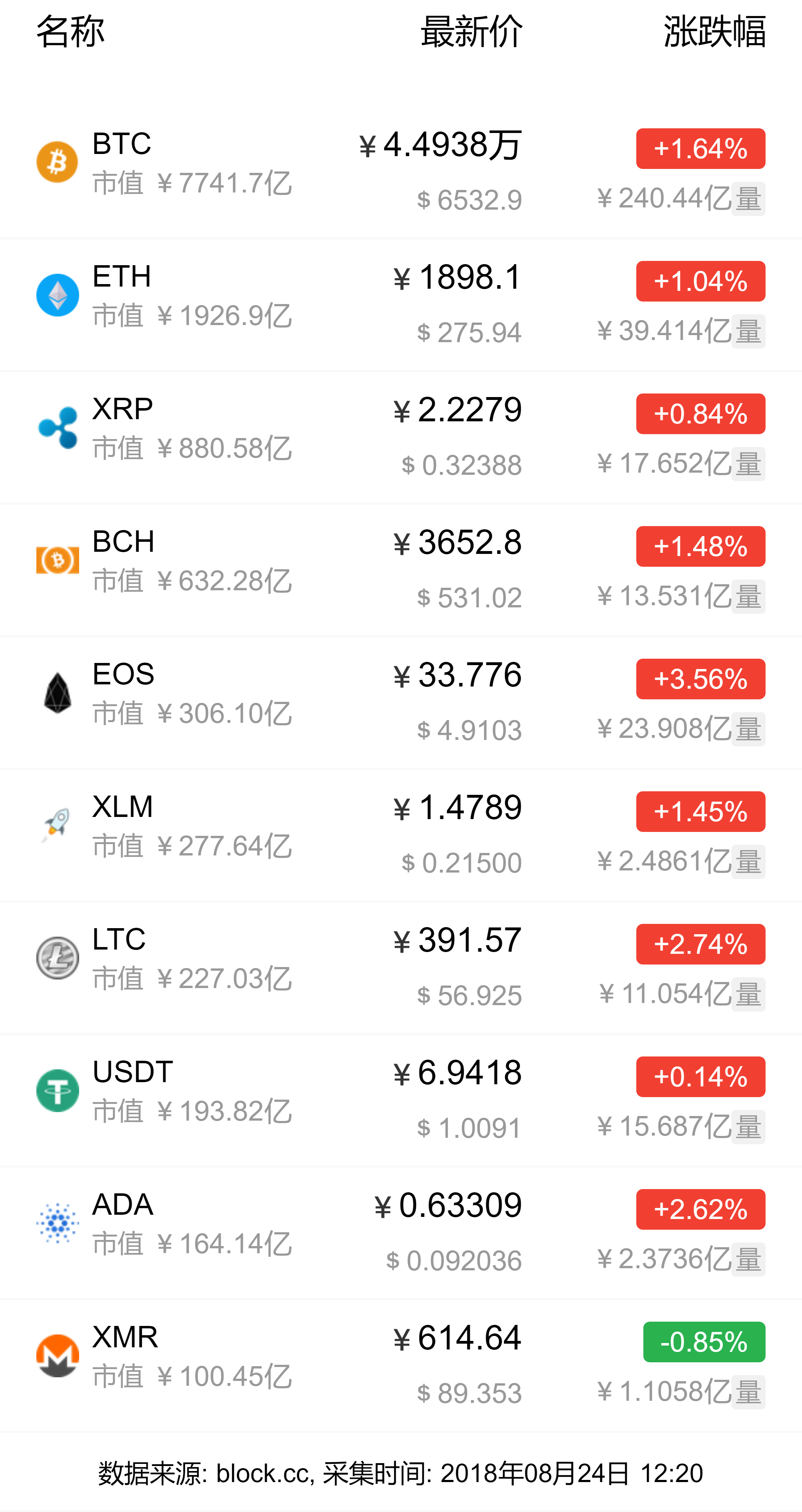 主流币种最新涨跌