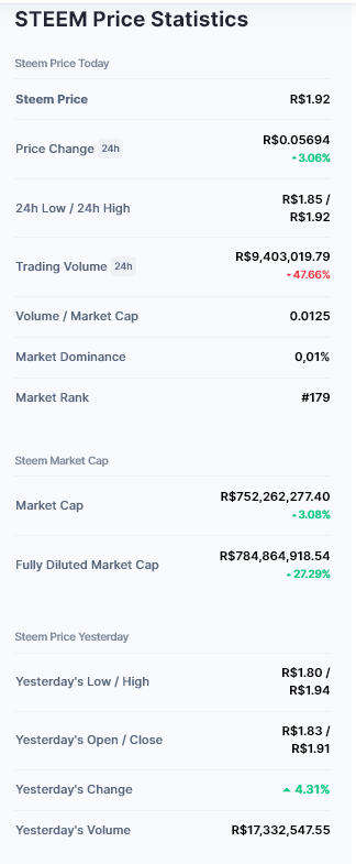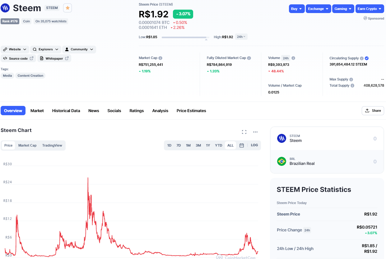 The live Steem price today is R$1,92 BRL with a 24-hour trading volume of R$9 403 020 BRL. Steem is down ,21% in the last 24 hours. The current CoinMarketCap ranking is #179, with a live market cap of R$752 262 277 BRL. It has a circulating supply of 391 654 484 STEEM coins and the max. supply is not available.