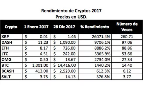 En el año 2017 los precios de las cryptomonedas como Bitcoin (BTC), Ethereum (ETH), Ripple (XRP) y muchas más, tuvieron un crecimiento increíble. La sig imágen muestra ese crecimiento...del 1 de Enero al 28 de Diciembre de 2017.