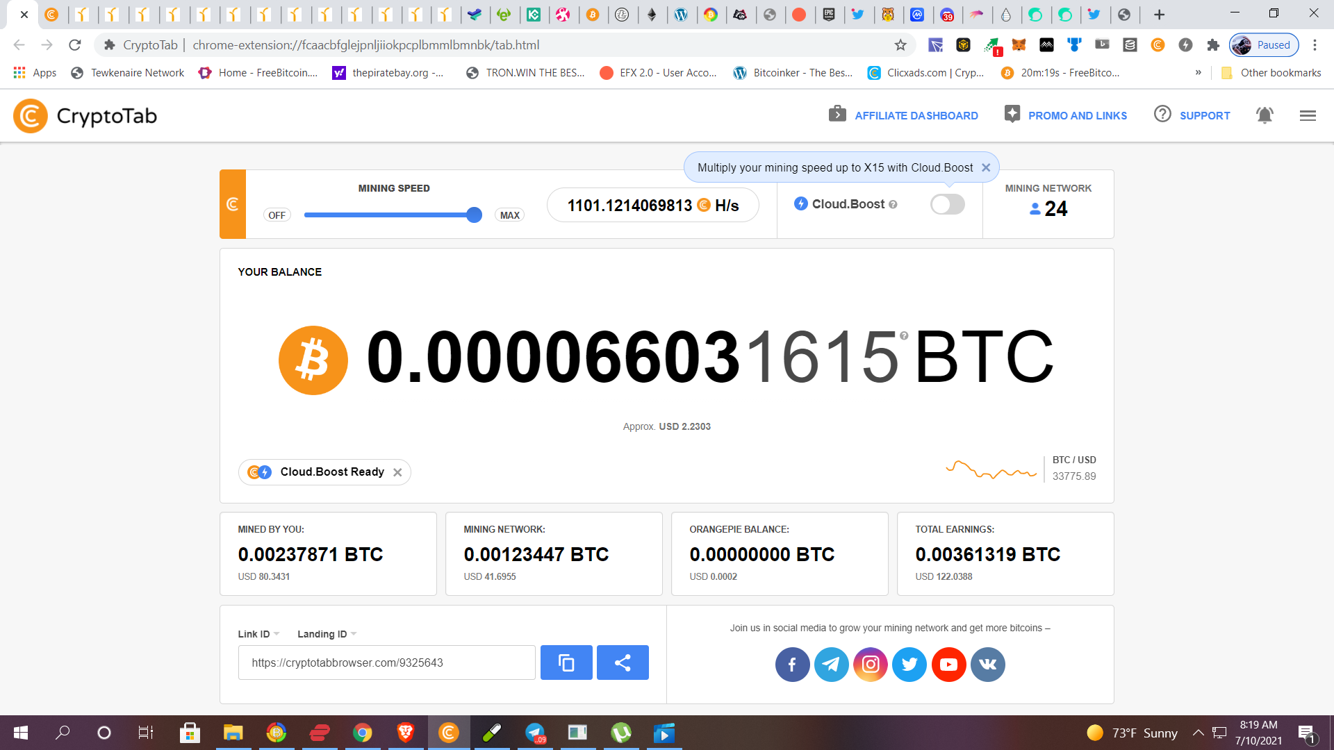 Cryptotab Browser is ABSOLUTELY FREE so you do not have to spend a dime unless you want to get the boost which speeds up your mining A LOT but really depends on which boost you purchase and I always get X20 on the PC bc PC mines so much faster than the phone bc phones are server dependant mining. You can earn so much more BTC from referrals bc each referral you get helps boost your mining and if your referrals refer then that is even better bc I believe you get 10 levels of referrals. You don't even need to purchase any boost if you have a bunch of referrals bc the referrals will boost the amount of BTC you earn 10 fold! But me personally I still buy the boost bc I get that much more. You can earn BTC for doing your everyday things like Facebook, waching YouTube, watching movies, and doing your social stuff. You just turn your miner on and let it do its thing and then you open a new browser window and then you just do what you normally do everyday but instead of making $0 passive income on Chrome you will be earning BTC for free with Cryptotab Browser! Also when you get off your computer to go do your thing whatever that may be just leave your Cryptotab Browser up and let it mine when you are at work, visiting your friends, families house, or at your SO's that way your BTC can stack up for you when you are AFK. Thanks for reading my blog. I really appreciate it! If you do join please join with my link right here to be part of my pool to help it grow. Bc I suck at getting referrals and I literally have only one. The only reason I know that having a bunch of referrals boost your BTC a lot is because one of my friends has over 100 referrals and it is crazy how much BTC he gets compared to me. LOL. So please join my pool and let's get a HUGE pool of refferals for us all so we can all make good FREE BTC!