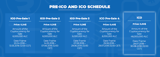 - Cryptocurrency Unit (Token) Price: 1 ALC = 0,50 USD