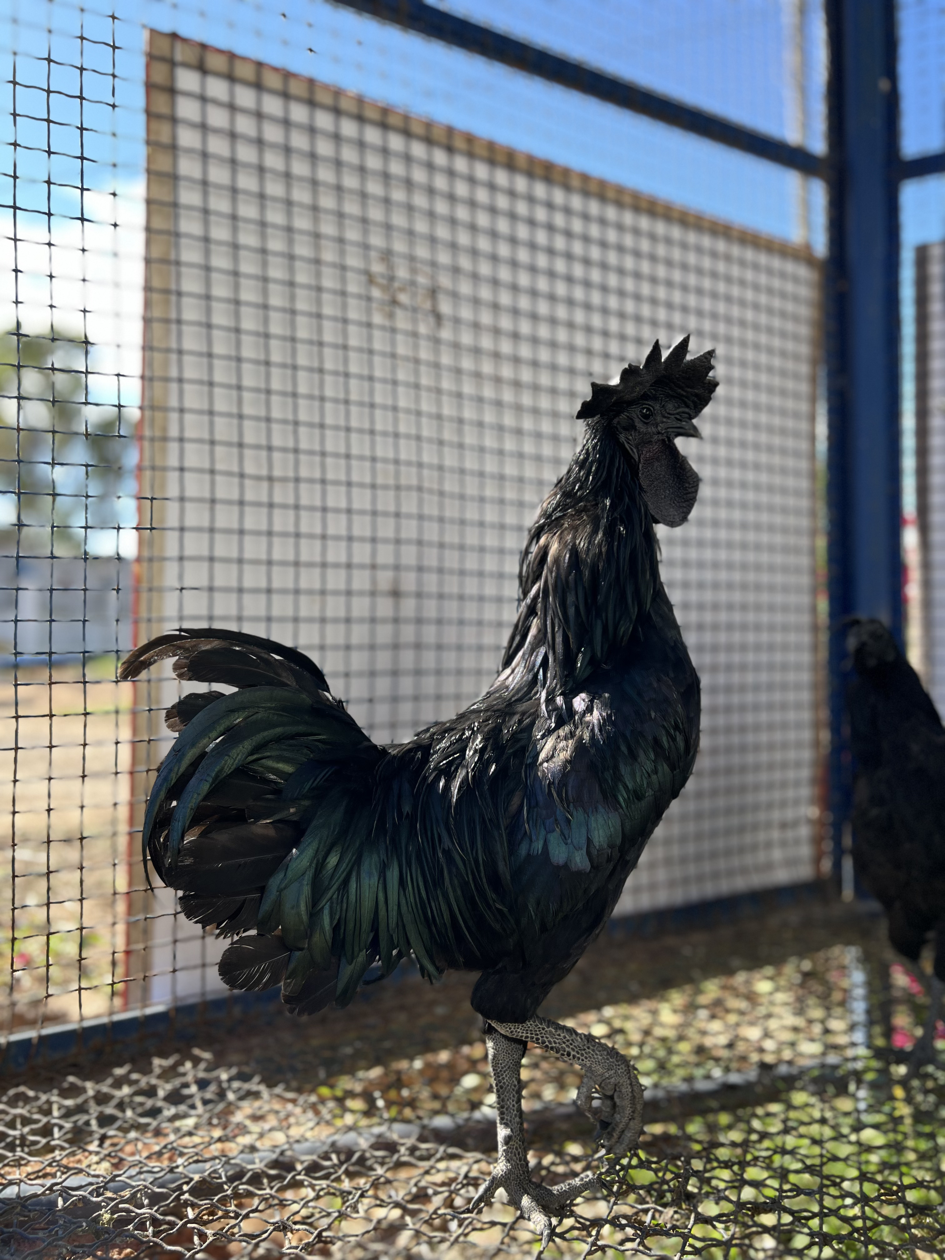 Ayam Cemani black rooster a sharp sound that defines moments and space.