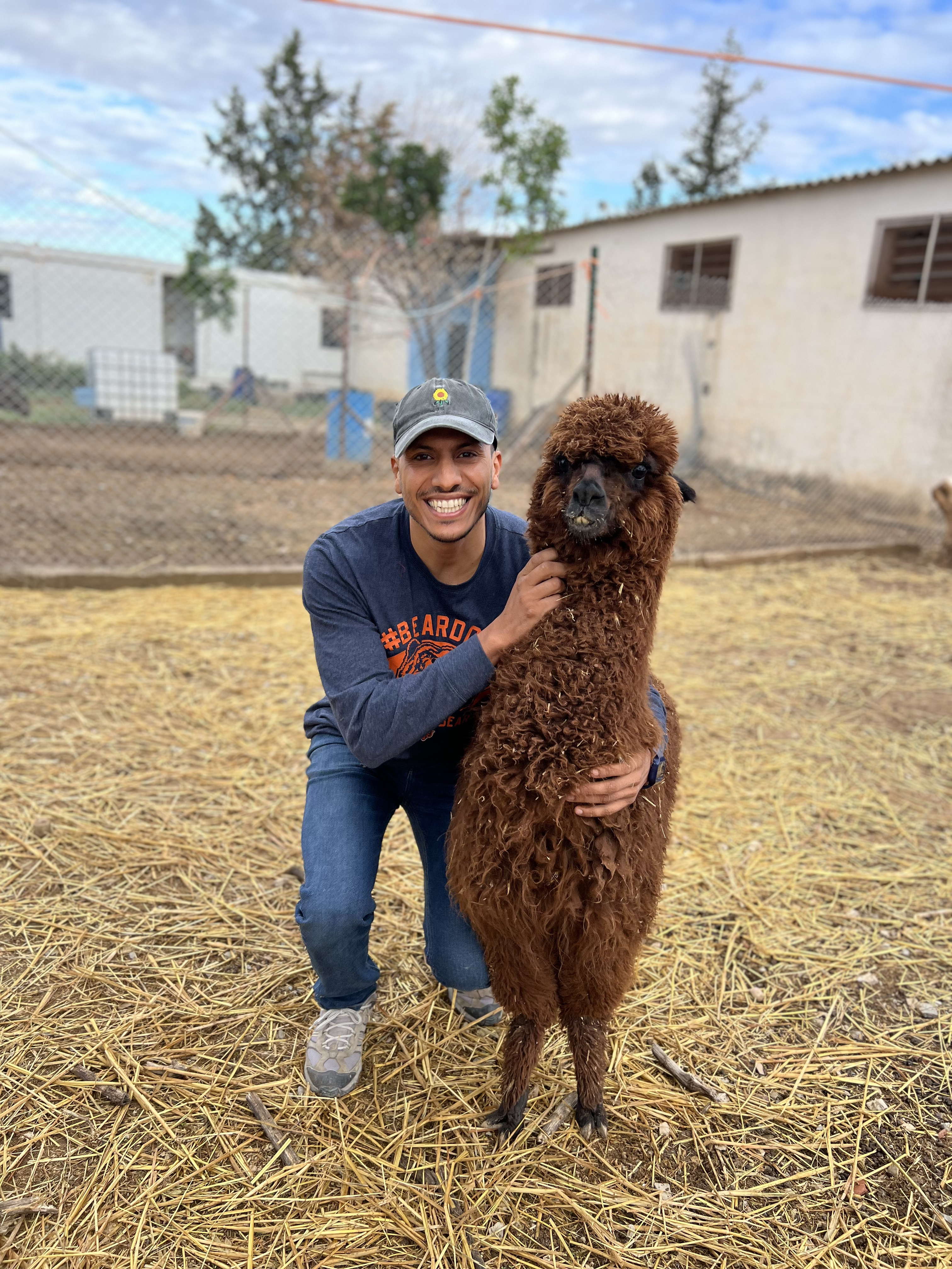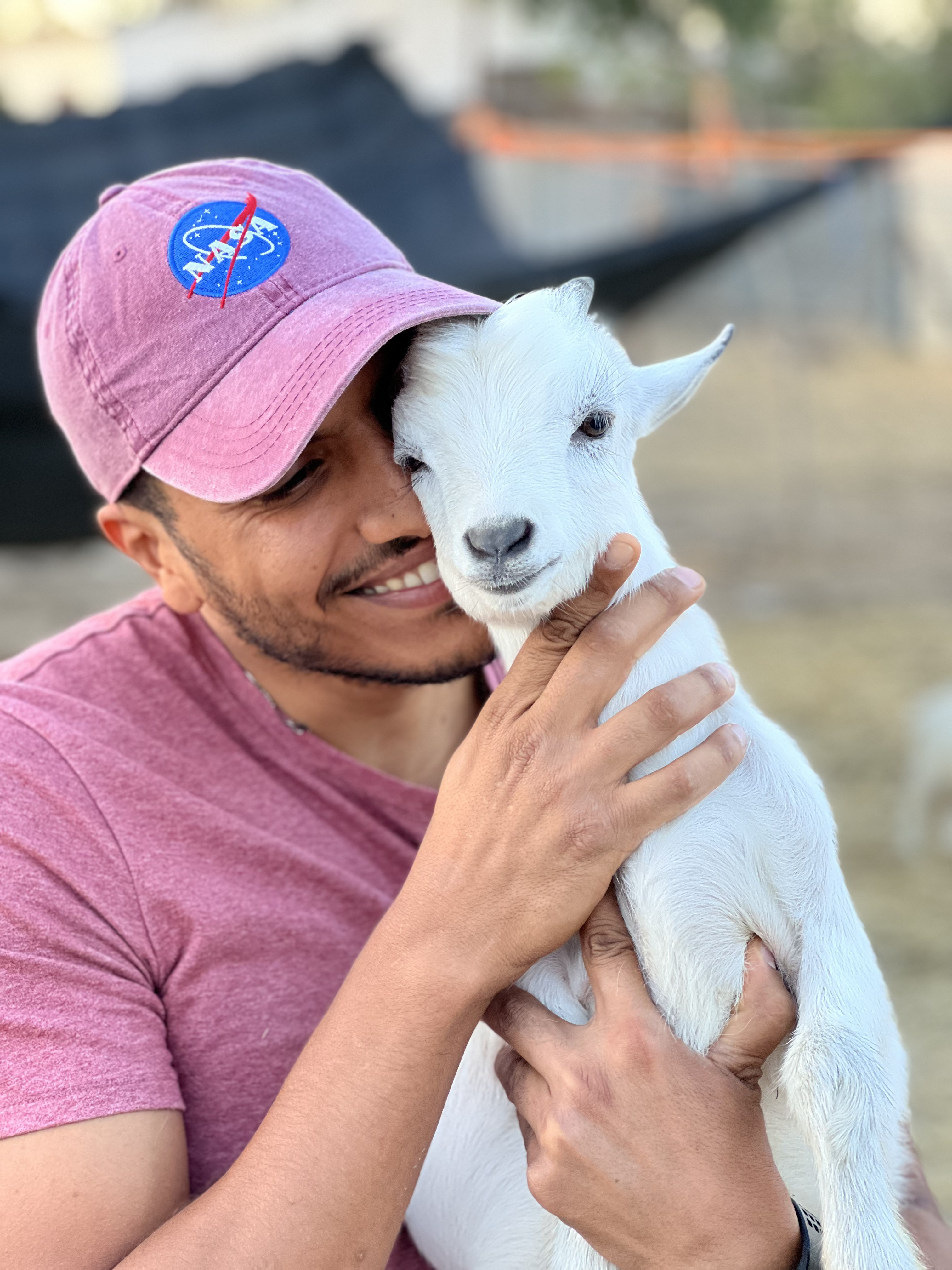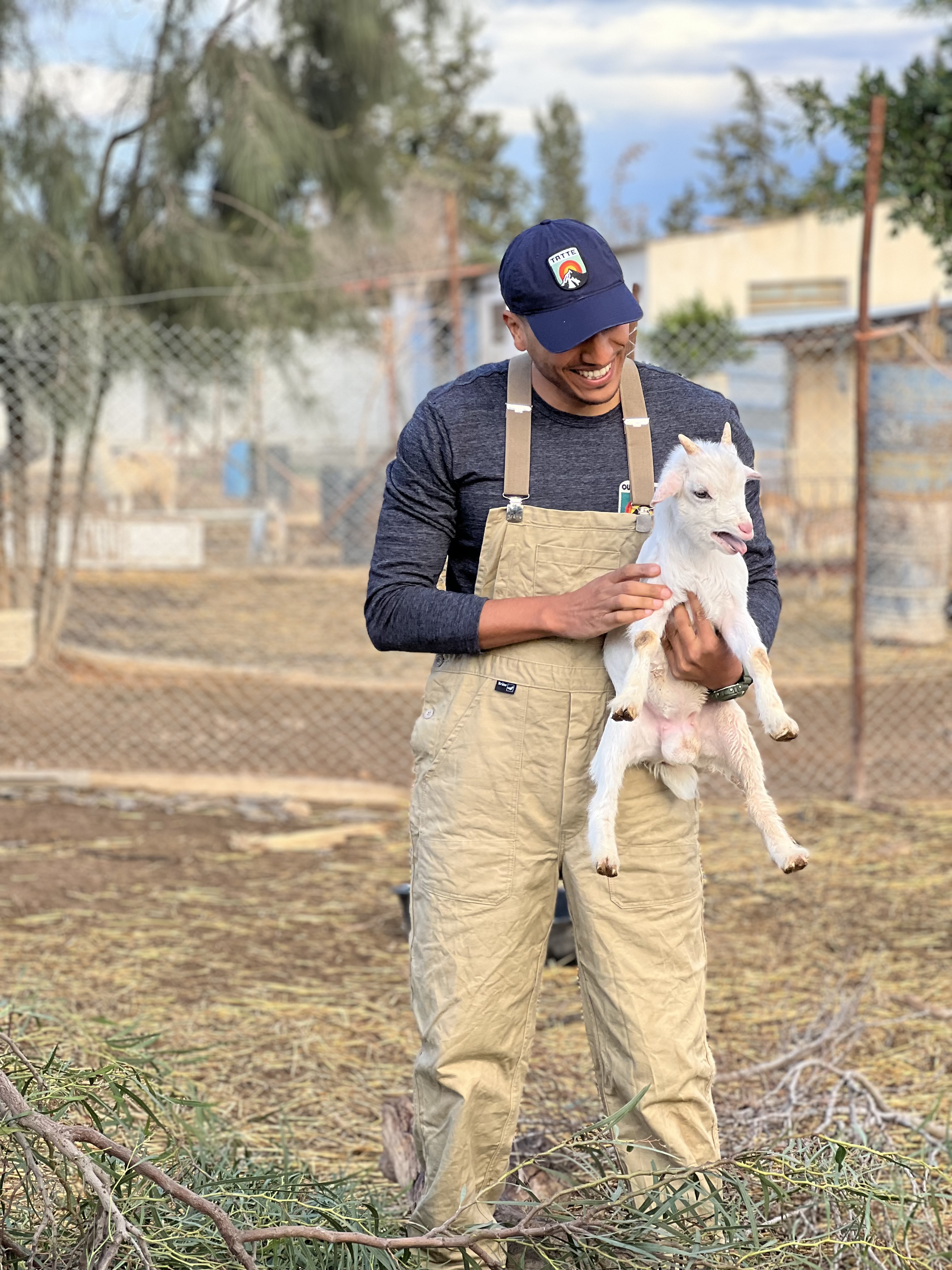 A gentle moment with a white baby pygmy goat at Ferme Abdallah.