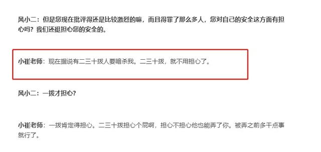节目后,也有网友向崔永元提问:您对自己的安全这方面有担心吗?崔永元回应称,现在据说有二三十拨人要暗杀我。二三十拨,就不用担心了。