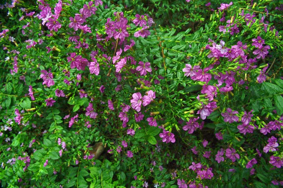 This species also has another name - false mexican heather. This sprawling shrub reaches a height of 60 cm. The stems are flat, branching resemble fern. The leaves are small, oblong. It blooms very lush and long, almost throughout the summer.