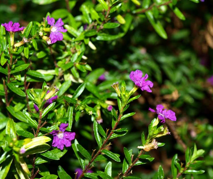 Cuphea hyssopifolia, the false heather, Mexican heather, Hawaiian heather or elfin herb, is a small evergreen shrub native to Mexico, Guatemala and Honduras. It grows to about 60 cm (24 in) high by 90 cm (35 in) wide and has purple, lavender or white coloured flowers and fine foliage.