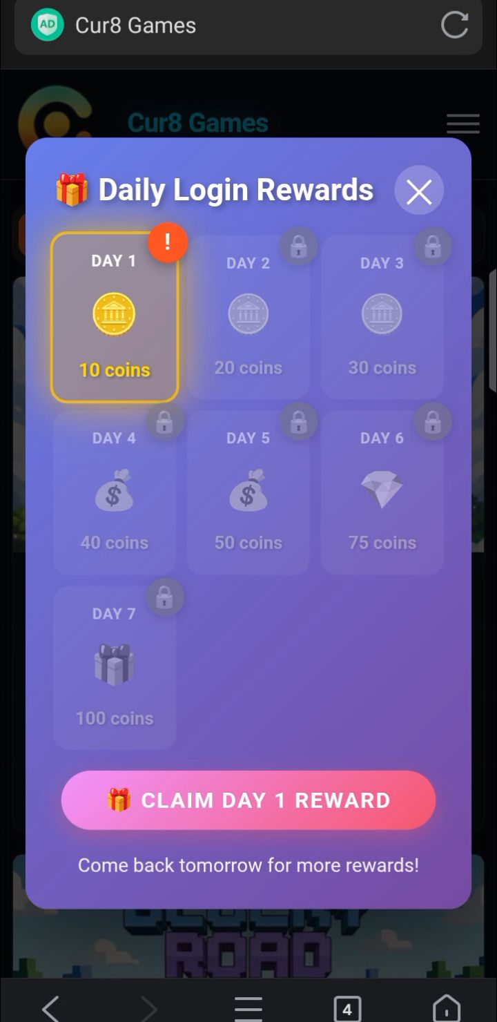 I opened the Cur8 Games website and signed up with my Steemit private keys and collected a daily login reward.