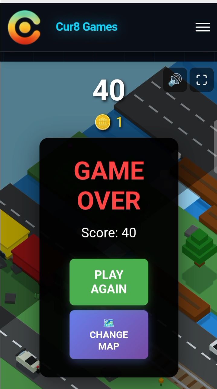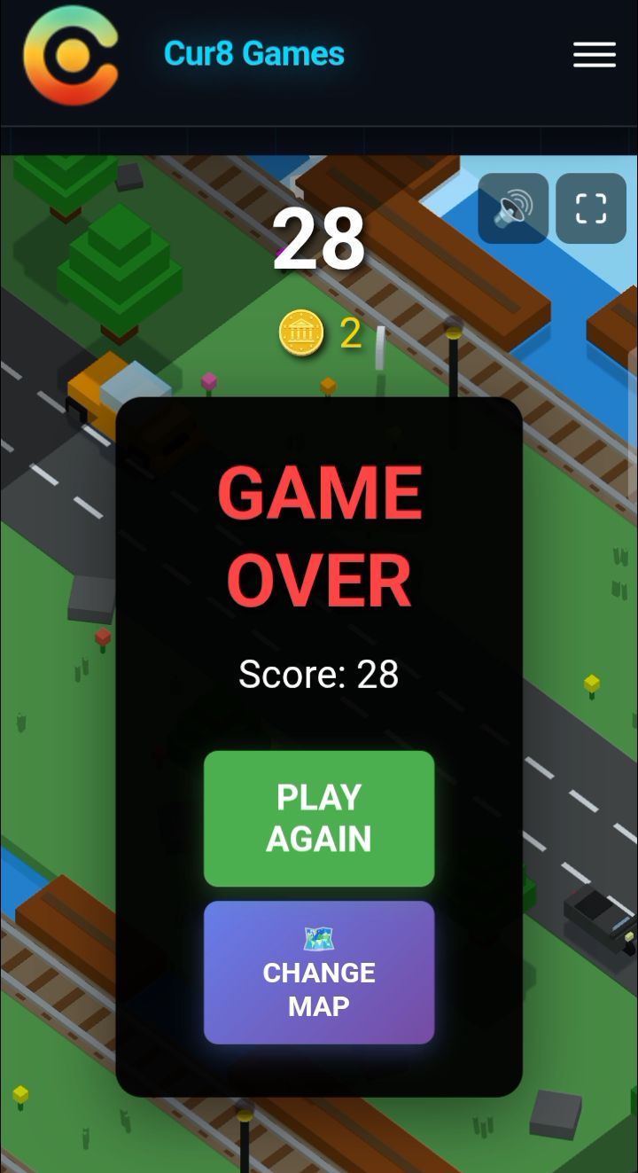 On my first one, I scored 28 before a train hit me and on my second one, I scored 40 after bypassing roads by riding on logs, but I accidentally sunk into the river and it was game over for me.