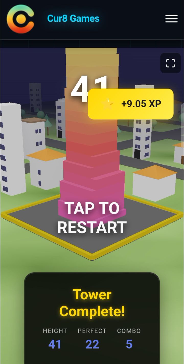 I had two tries and on the first, I was able to stack the tower all the way to a height of 41 and achieved a max combo of 5 before it fell. During this try, I also scored 22 perfect blocks and received +9.05 XP. I don't know what the XP is for so if anyone does they can tell me in comments please.