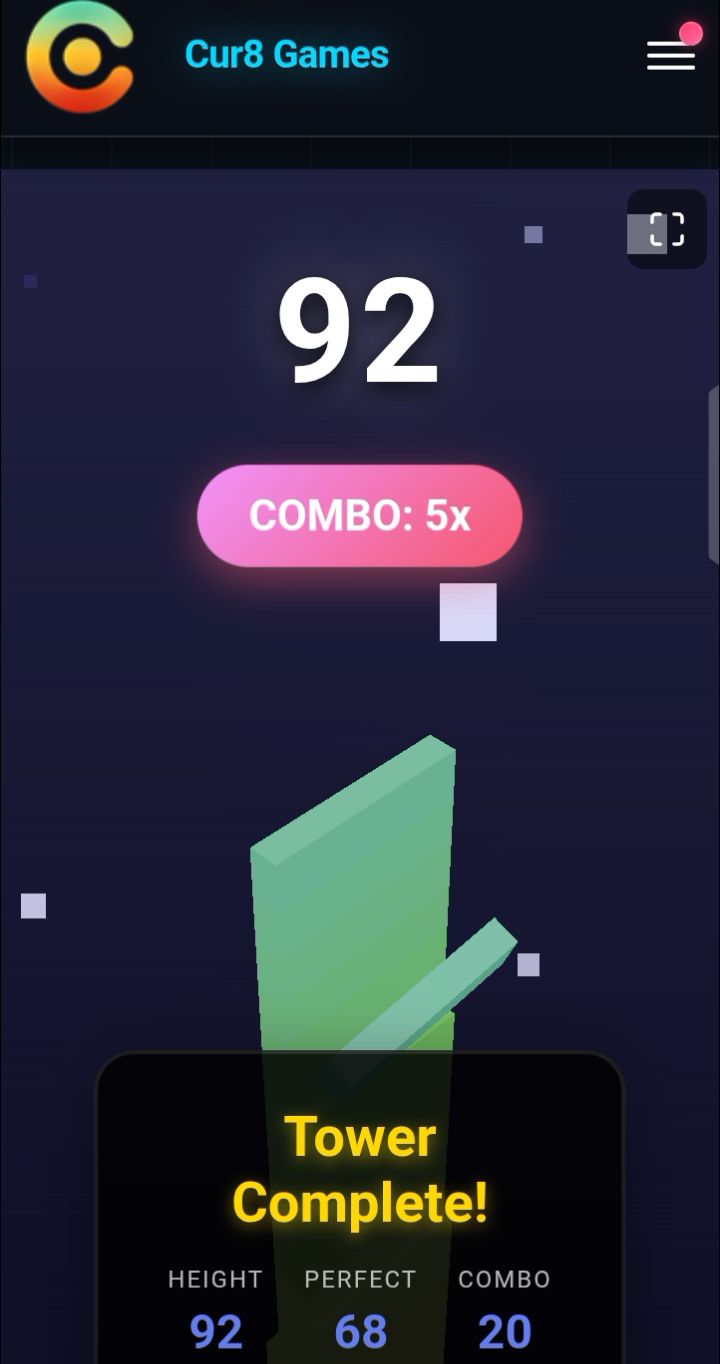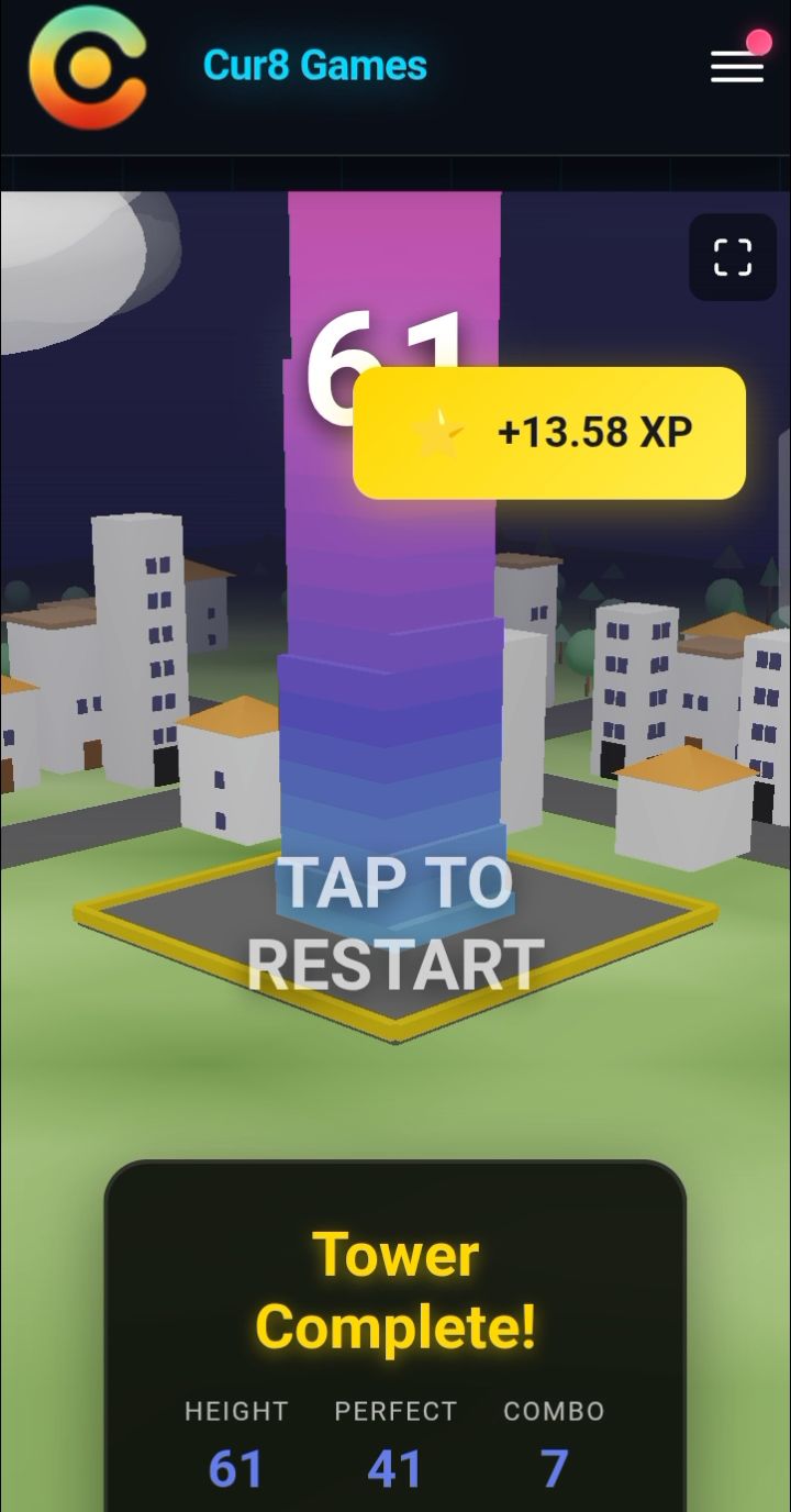 Game 2 was to a height of 61 with 41 perfect blocks. I was more experienced with 7 combo, earning me 13.58 XP.