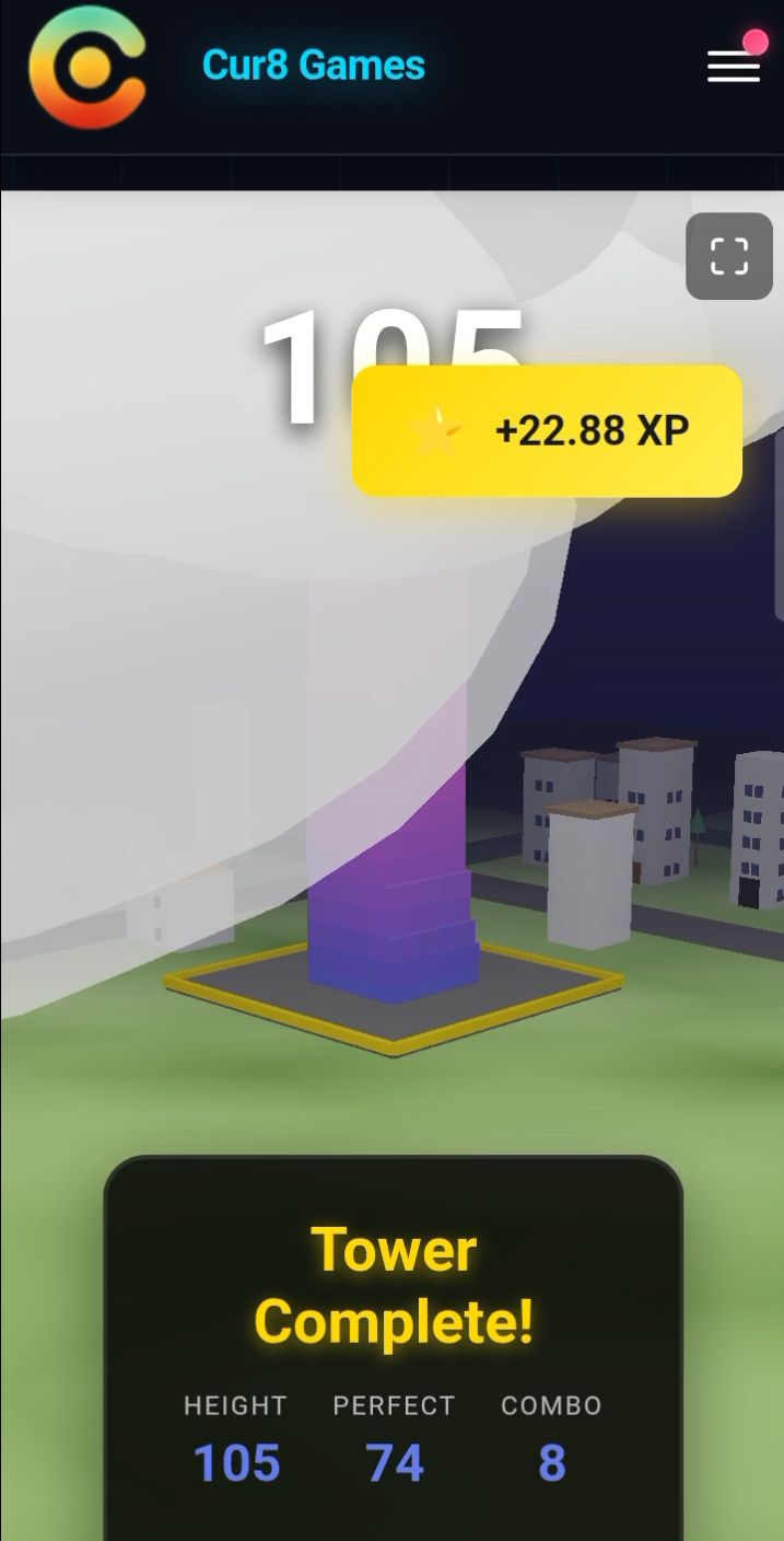 After the Blocky Road game I went back to play Sky Tower again, which I managed to reach a height of 86 with 15.45 XP, and a session best height of 105, giving me 22.88 XP after getting an 8 combo and 74 perfect blocks.