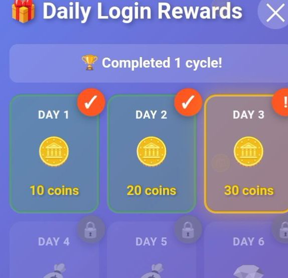 Today when I logged onto Cur8 Games, I got the usual notification for a daily login bonus, claiming my 30 coins for day 3. I had been playing this for 3 days, so my login bonus was only a level 6 explorer, but for those just starting out, you get a 1.0x CUR8, login reward for day 1, a boost of day 2, and day 3, so on till the end of the week.