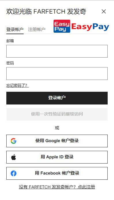 Farfetch 的注册流程很简单,只需提供邮箱即可完成,不需要上传身份证或进行身份验证。注册完成后即可浏览、收藏和下单商品。
