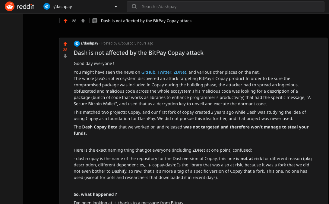 Dash not affected by Copay / Bitpay attackdashpay (62)in #dash • 7 years ago https://www.reddit.com/r/dashpay/comments/a0ydmf/dash_is_not_affected_by_the_bitpay_copay_attack/ #copay #bitpay #cryptocurrency