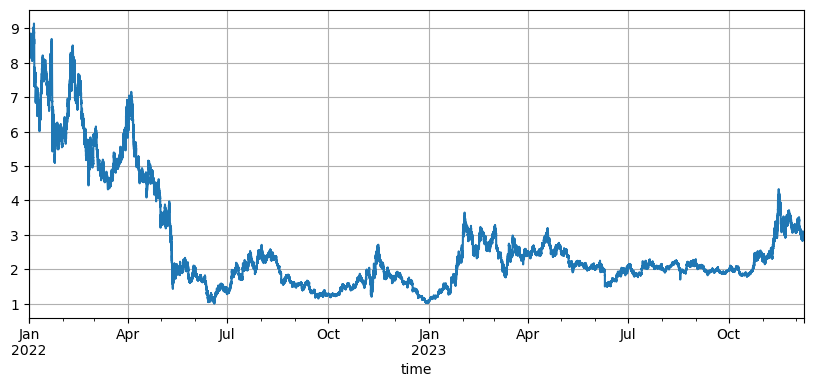 Generally, it is enough to use K-line data. For accuracy, the smaller the K-line period, the better. However, to balance the backtest time and data volume, in this article, we use 5min of data from the past two years for backtesting. The final data volume exceeded 200,000 lines. We choose DYDX as the currency. Of course, the specific currency and K-line period can be selected according to your own interests.