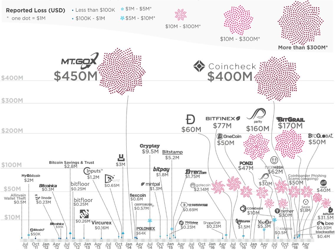 The following chart represents data collected by cryptoaware.org and designed by howmuch.net shows a group image describing the size of the hack and the timeline with the logo of the exchange/wallet where it lets us observe how frequently and to what degree the crypto-market have been attacked over recent past.
