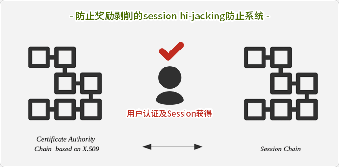 生成的认证书将无TTP(Trusted Third Party),去中央化并被保存,日后相同账户的认证书生成邀请将被全部退回. 用在认证书电子签名上的private key,通过用户密码和salt值来hashing,生成1024byte长度的密码,用户密码不单独保存在系统内,认证书 用户须通过去中央化的Certificate Authority Chain才能保存。用户必须通过去中央化的认证书才能获得,对话在Session Chain中则可以自动共享,因此无法进行伪造更改.