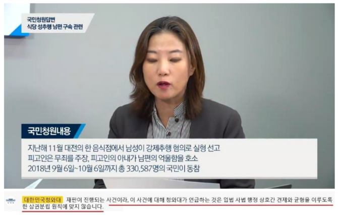 여성징병제 청원하니 여군 장교를 늘리겠다는 곳이라 답변을 크게 기대한건 아니지만 과연 청와대에서 어떤 답변을 할지는 궁금했었는데 이제는 아예 답변을 회피해버렸다. 삼권분립 때문에 답변을 할 수 없다. 말만 들어보면 그럴싸 하다. 하지만 삼권분립은 다른 부서에 아예 관여 안 하겠다는게 아니다. 국회가 탄핵을 하는것처럼 어느 부서가 문제가 있다면 견제를 하는 의미도 있다. 그런데 판결이 이상하다는 청원에 단순히 삼권분립을 외치는게 답일까?