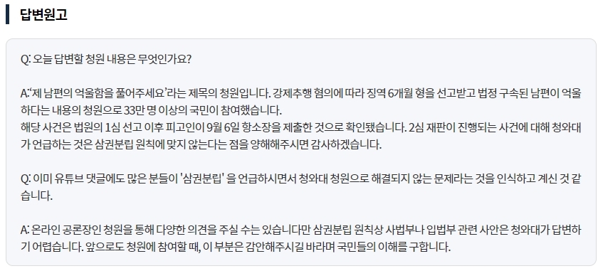 삼권분립이라도 입장 표명 정도는 할수 있는거지. 공정한 재판을 할것을 사법부에 요청했다던지 하는식의 가식적인 답변이라도... 가상화폐, 난민문제 지들이 대답하기 싫은건 어떤 핑게를 써서라도 대답을 회피해버리는구만. 그런 핑게들 댈거면 굳이 국민 청원이라는걸 왜 만든건지