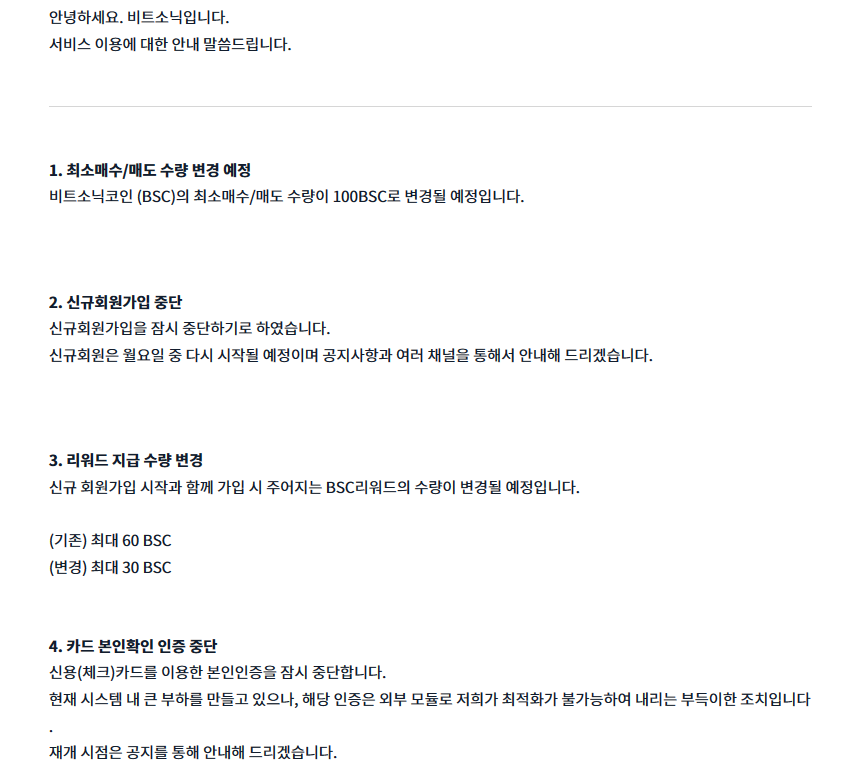 서버 점검이나 일련의 흐름을 보면 비트소닉 운영진들의 예상 이상으로 비트소닉에 사람들이 몰린게 아닌가 싶어. 단순한 가입리워드가 현금기준으로 3만원을 넘어가버리다니 말 다했지. 지금은 또 떡락중이라 3만원에 못미치는거 같지만....어쨌든 그래서 하향 조정은 당연한거 같긴한데 그러면서 최소 거래 수량을 100개로 제한하는건 좀 상술이 심하네 ㅎㅎㅎㅎ