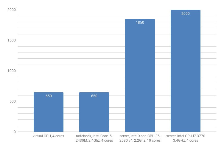 Tests were used four kinds of CPU, and the best results (2000+ transactions per second) were obtained on a Quad-core Intel CPU i7-3770 3.4 GHz.