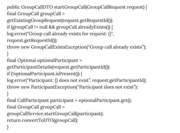 For example, let's take a sample code where you are trying to start a group call with a participant where you first validate if a group call already exists with the participant, if not fetch the participant detail and then start group call.