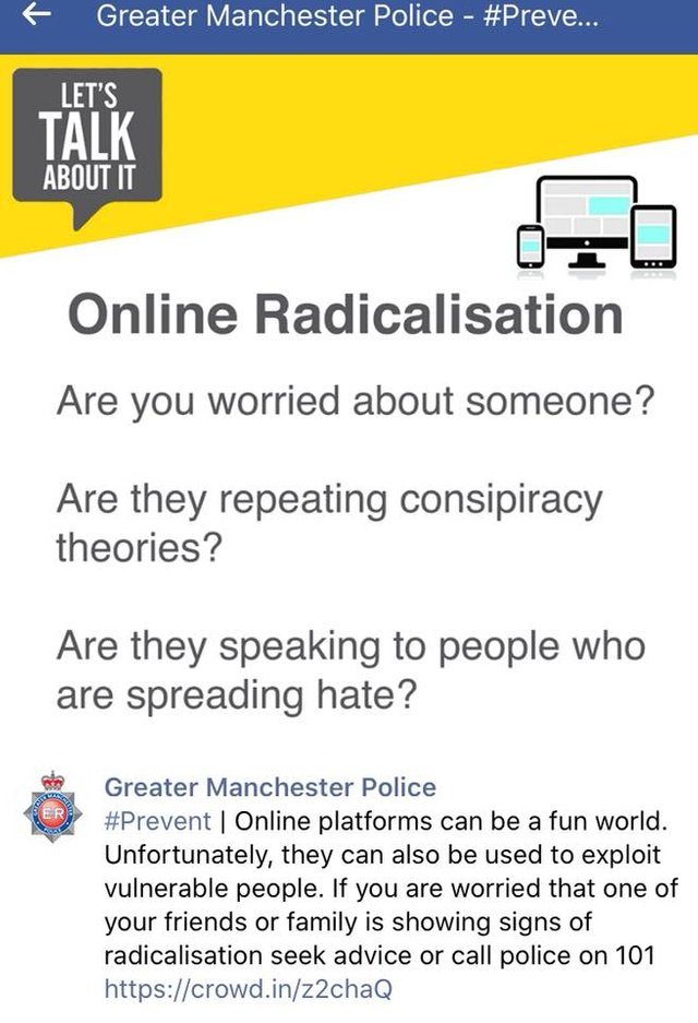 For those that are unaware, Prevent is the UK’s counter-terrorism strategy. For several years I have been writing about how the world of conspiracy theories would be eventually drawn into the terror, hate, and mental health arenas. Once these connections have been made they would be used as the justification to restructure broader free speech definitions and mandated "truth" stipulations. Below we can find a tweet from Manchester police that I borrowed from a great post by @shepz1.