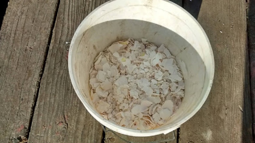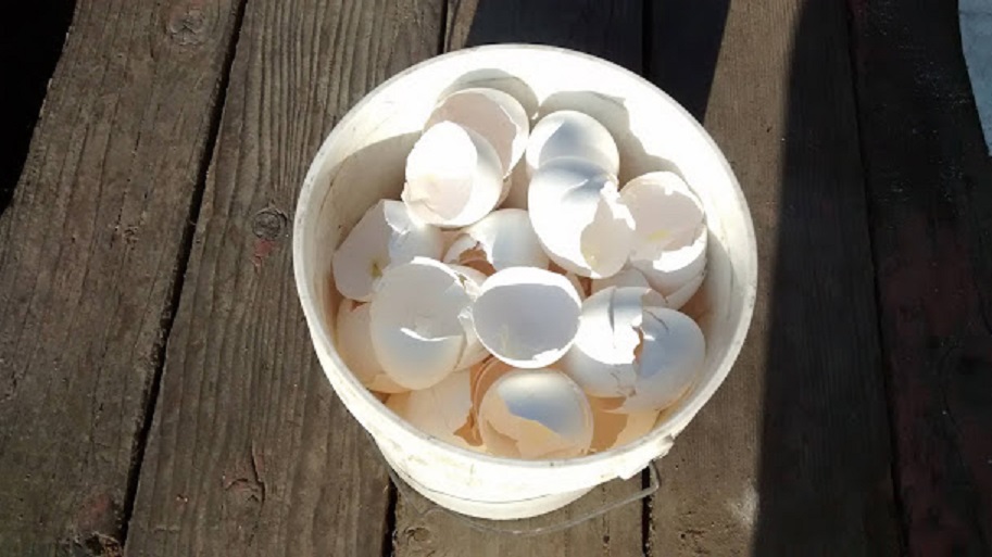 So right here when the egg shells reach to the top of my bucket where I hold my egg shells, I just take a big stick and pound the egg shells into smaller pieces.
