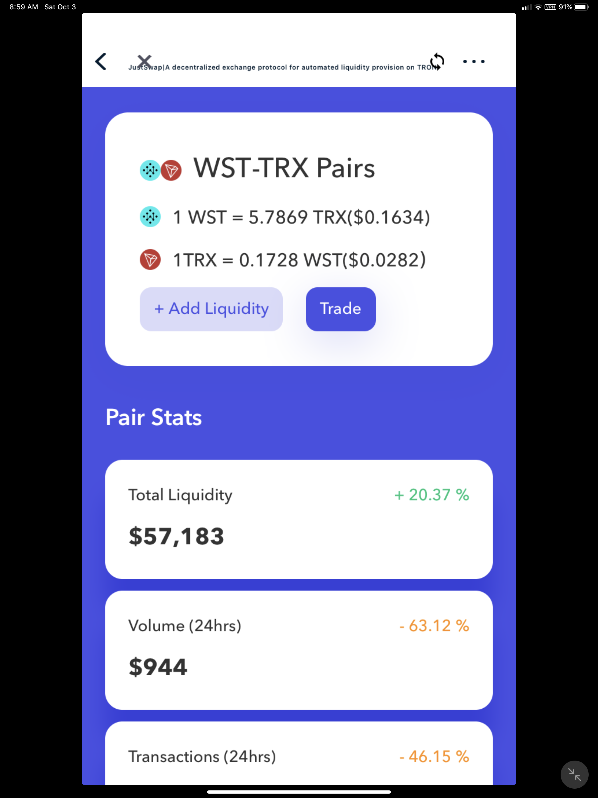 Third, the Liquidity Pool has 53,000 USD in deposits of WST and TRX, this is the wrapped Steem- Tron Trading Pair!