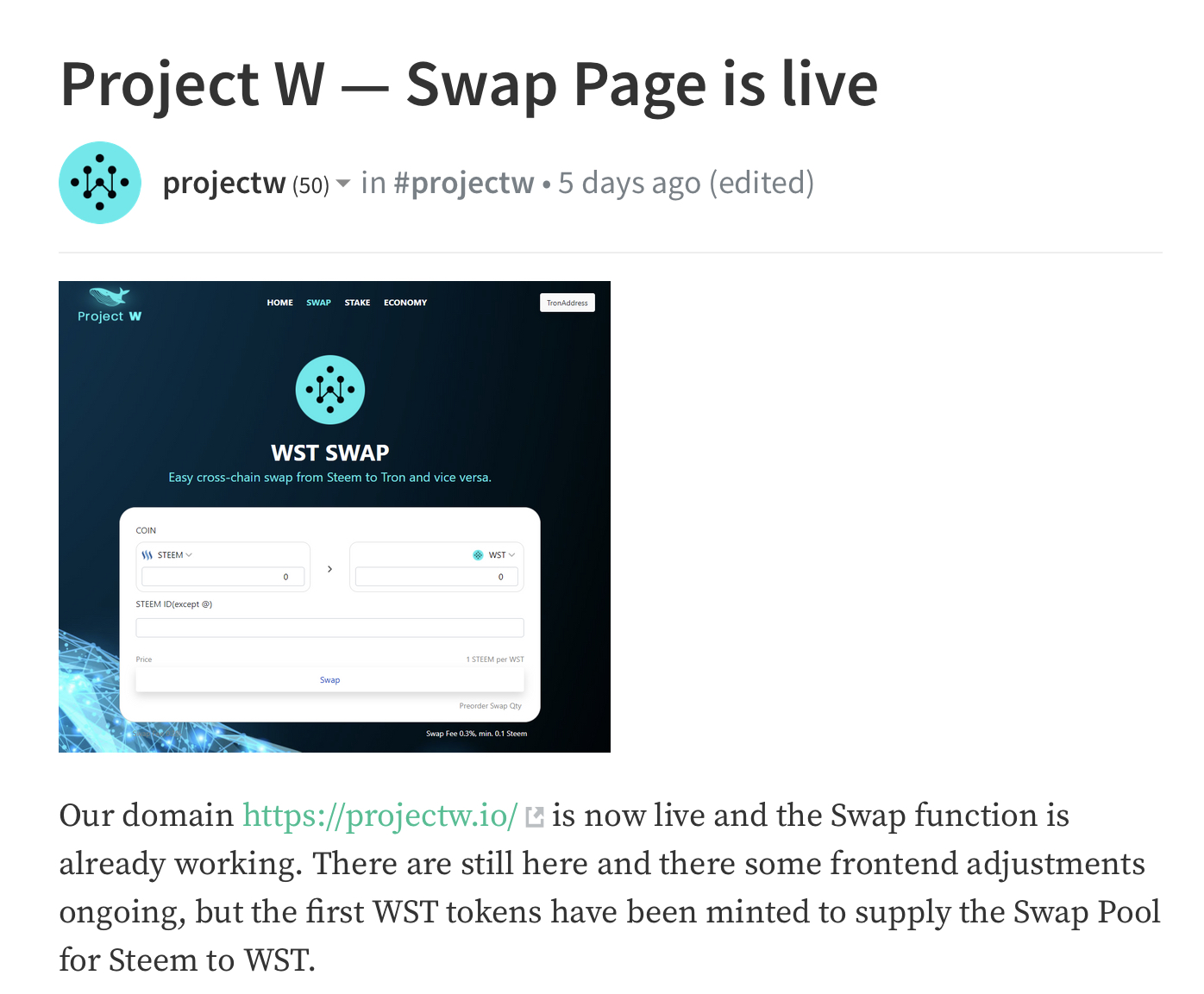 You can go to the project website www.projectw.io and follow the instructions there for wrapping your Steem and connecting your Tron wallet to the site and then to www.justswap using the Tron Link wallet internal web browser (this sounds complicated, but when you do it, it’s straight forward... or it’s as straight forward as the rest of crypto... LOL